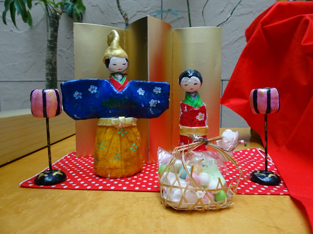 粘土で作った手作りの雛人形と、巻物です。